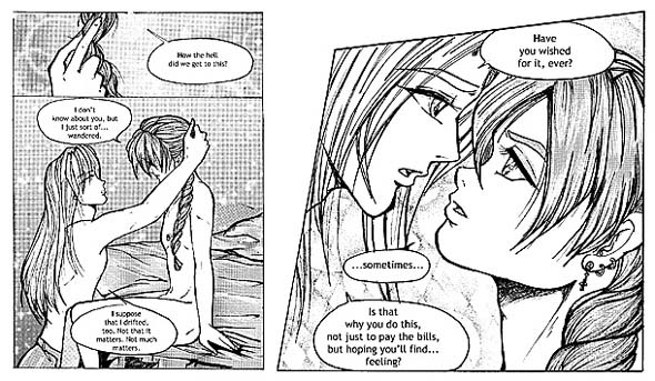 Two panels from Burning (2002). Artists: Rose Argent, RazorQueen, Gaby Maya, Yoshie, and Datenshi