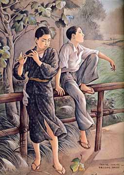 About the time Yoshiya began publishing, the artist Kashō Takabatake (see sidebar below) portrayed bishōnen (beautiful boys) in boys' magazines. The adventure stories he illustrated showed them bonding by rescuing one another or sharing the same sleeping bag for warmth. Thorn says his works "reflected idealized relationships among boys in a time when boys and girls lived in separate worlds, and it was common for...young people to have romantic feelings for and even sexual involvement with the same sex...." A collection of Kashō's works, Bishōnen zukan (Illustrated Compendium of Beautiful Boys), was published two years ago. It includes an essay by the well-known boys' love manga artist Keiko Takemiya. (16)