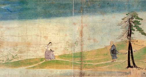 According to the story told by the scroll, below, the figure on the right is a monk. Longing for companionship in his old age, for three years and three months he made monthly visits to the Hasedera temple, a shrine to the Buddhist deity Kannon, to pray he might find a disciple. One night, on a desolate plain below the temple, he sees a lovely youth of 13 or 14 dressed in a shimmering lavender robe playing a melancholy tune on a Chinese flute. So beautiful is he the monk takes him for an apparition.