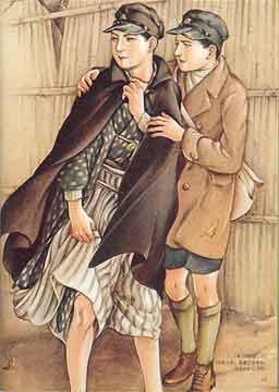 The youth in the kimono protects the one in Western dress. From the magazine Nippon shōnen (Japanese Boy), 1929