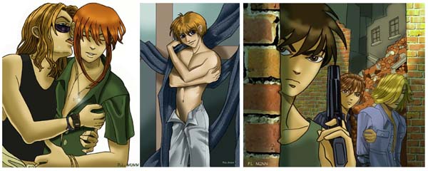 Artist: Pluto www.thatdamncat.com and www.umbrellastudios.com Anria's Thinking About Forever pits Duo against a relationship between fellow pilots Heero and Trowa. We see Duo struggling mightily to overcome his inhibitions to join them in a ménage à trois. Scenarios like these are not necessarily fictional. The noted author Samuel Delany said he was approached at a science-fiction convention by a very young man who asked him if it were possible for three people to have a relationship. Delany said it was, at which the young man "gave an immense sigh of relief... [and] I thought, 'I am doing something right'" (Westerfeld). All good fiction is transgressive, says historical novelist E.L. Doctorow. Writers must "have the sense of...doing something forbidden.... If you have that feeling, the work is going well." (53) Good fiction needs more, of course. The sex in gay erotica written by amateurs is transgressive, but often it seems an end in itself. In yaoi, the sex serves the goal of getting the characters to connect. Yaoi has not escaped censorship. Sharon Kinsella describes a moral panic in Japan in 1989 which resulted in the police arresting about 80 people, almost all teens or in their twenties, and confiscating thousands of dōjinshi from Tokyo stores (1998a). She documents how parents' groups which claimed to be protecting children were in reality fronts for government agencies involved in controlling manga. One such, the Tokyo Mothers' Society, operated out of a police station (2000a:152-155). (54)